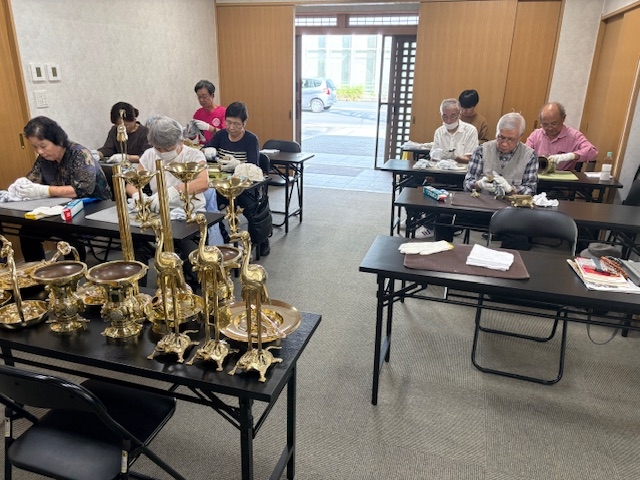 その後は来月13日の盂蘭盆会法要に向けて、お集まりいただいた皆で仏具のおみがきを行いました。回数を重ねてきたせいか、皆さまの技術が上達し、早くかつ綺麗に磨いてくださいました。お力添えありがとうございました。是非盂蘭盆会法要にお参りくださいませ。