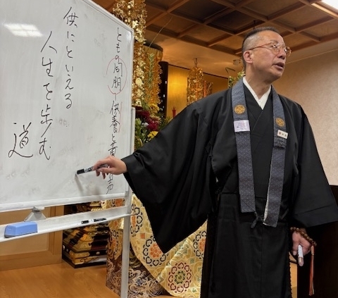 今年の報恩講は東京宗務出張所所長の中根慶滋氏よりご法話を頂戴いたしました。南無阿弥陀仏と念仏申すこと、そして念仏申すことによって開かれてくる世界について丁寧に確かめていただきました。ご法話を受け、私自身これからも名響寺に集う有縁の方々と共に、親鸞聖人が顕かにしてくださった教えを聞き、阿弥陀の願いに出遇っていく生活をあゆんでいきたいと思わせていただきました。