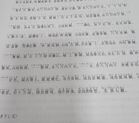 前回に引き続き第七華座観について見ました。今回のところでは、仏が立つ蓮華についての具体相が次々に語られ、それらは主に宝玉で飾られており光明を放つことを想い描くようにと説かれます。宝玉もいくつか具体名が挙げられますが、梵摩尼宝という意のままに宝や衣服、食物を出し病苦等を除くという宝玉が出てくるように、苦悩の者を思うがごとく救い遂げる仏のはたらきも想うことが大切だと確かめました。