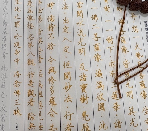今回は第八像観の後半部分について見ました。阿弥陀仏の脇侍である観世音・大勢至菩薩が阿弥陀仏と同様に蓮の花に座っておられる姿を想い描くべきことが説かれている様子が実際に表現されているお寺の写真を見たり、親鸞聖人が着目した「若有合者、名爲麤想」や「於現身中、得念佛三昧」の文について確かめました。