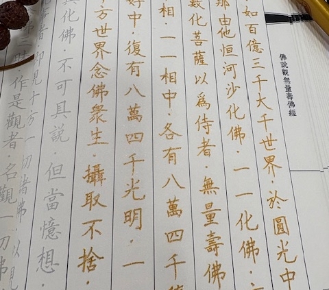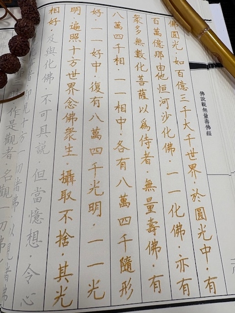 今回から第九真身観に入りました。その前半部分に説かれる「一一の光明遍く十方世界を照らす。念仏の衆生を摂取して捨てたまわず。」という言葉に着目して、親鸞聖人のご和讃や、善導大師が説く「三縁(親縁・近縁・増上縁)」について見ることで、阿弥陀仏のはたらきと衆生の関係について確かめました。