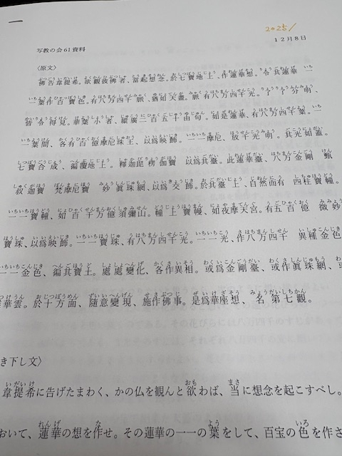 今回は華座観で具体的に想い描くべきことが述べられた後に、それを正確に観ずることで五万劫に及ぶ迷いの本となる罪が除かれると説かれる箇所を見ました。また、華座には本願のはたらきが表現されていることも確かめました。次回は2月9日(月)14時からの開催を予定しております。第八像観について見ていきます。…