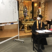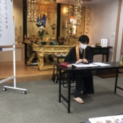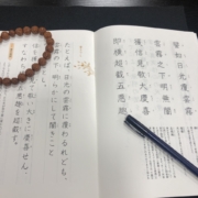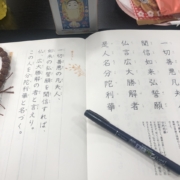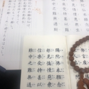 前回で「正信偈」を一通りたずね終えたということで、本日からは『仏説阿弥陀経』の書写をしていきます。初回ということで、『阿弥陀経』について少し見ていきますと、真宗では浄土三部経と呼ばれる『大無量寿経』・『観無量寿経』、そしてこの『阿弥陀経』(『小経』)を具体的には言って、大事な聖典としております。親鸞聖人はその浄土三部経を『大無量寿経』を真実の教とし、『観無量寿経』と『阿弥陀経』は方便の教として見ておられます。方便というとつまらないものだと思われるかもしれませんが、方便はとても大事なのです。方便があってはじめて真実に触れるということがあるわけです。その方便の教である『仏説阿弥陀経』は「無問自説経」とも呼ばれます。経典の多くはその経典が説かれることになった背景、「発起序」というものが描かれます。例えば『観無量寿経』では王舎城の悲劇が描かれますが、経典が説かれるきっかけとなる大事な問いがこの『阿弥陀経』にはありません。釈尊が智慧第一の舎利弗に対して、舎利弗よ舎利弗よと言ってずっと語っていかれます。普通はどうですか?という問いに対して、釈尊がお答えになるという形ですが、舎利弗が問うことはありません。なので『無問自説経』と呼ばれます。